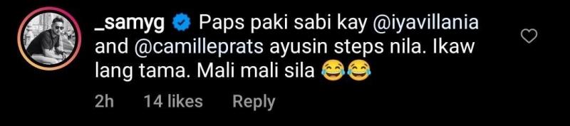 Radio jock and former Eat Bulaga host Sam YG also went along with Kuya Kim's caption and replied, “Paps pakisabi kay @iyavillania and @camilleprats ayusin steps nila. Ikaw lang tama. Mali mali sila” with two laughing emojis.