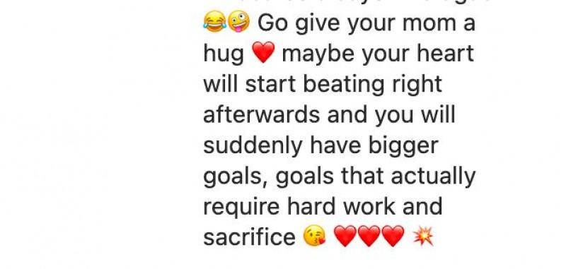 She added, “Go give your mom a hug. Maybe your heart will start beating right afterward, and you will suddenly have bigger goals. Goals that actually require hard work and sacrifice.”