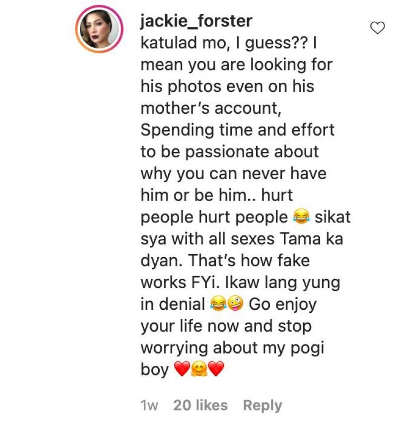 Jackie replied, “Katulad mo, I guess? I mean, you are looking at his photos even on his mother's account.