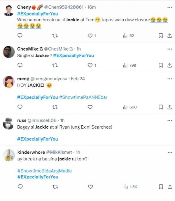 May ilan nagulat at napatanong sa X (dating Twitter) kung nakipag-break ba talaga si Jackie sa kanyang boyfriend na si Tom Doromal. Meron din iilang netizens na nagkomento na bagay ang naturang host sa guest ex na si Ryan.