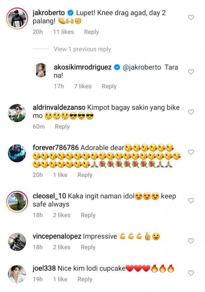 Sa Instagram, ibinahagi ni Jak ang kanyang paghanga kay Kim, "Lupet! Knee drag agad, day [two] pa lang!"