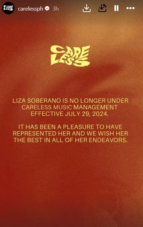 "Liza Soberano is no longer under Careless Music Management effective July 29, 2024."
