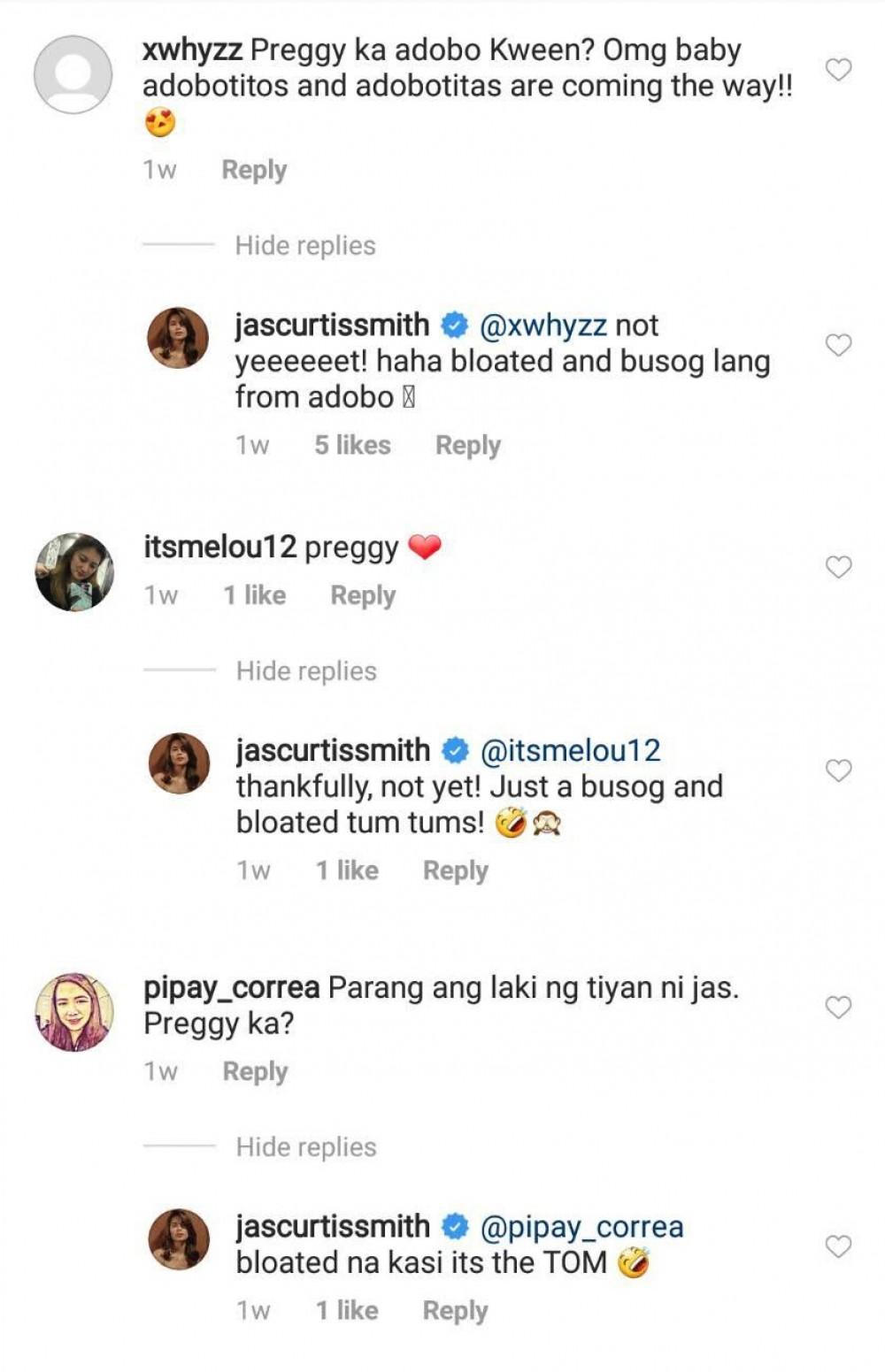 Itinanggi ni Jasmine Curtis-Smith na siya ay nagdadalang-tao matapos mapansin ng ilang netizens na tila malaki ang kanyang tiyan sa isang larawan na ipinost niya sa Instagram noong October 27.