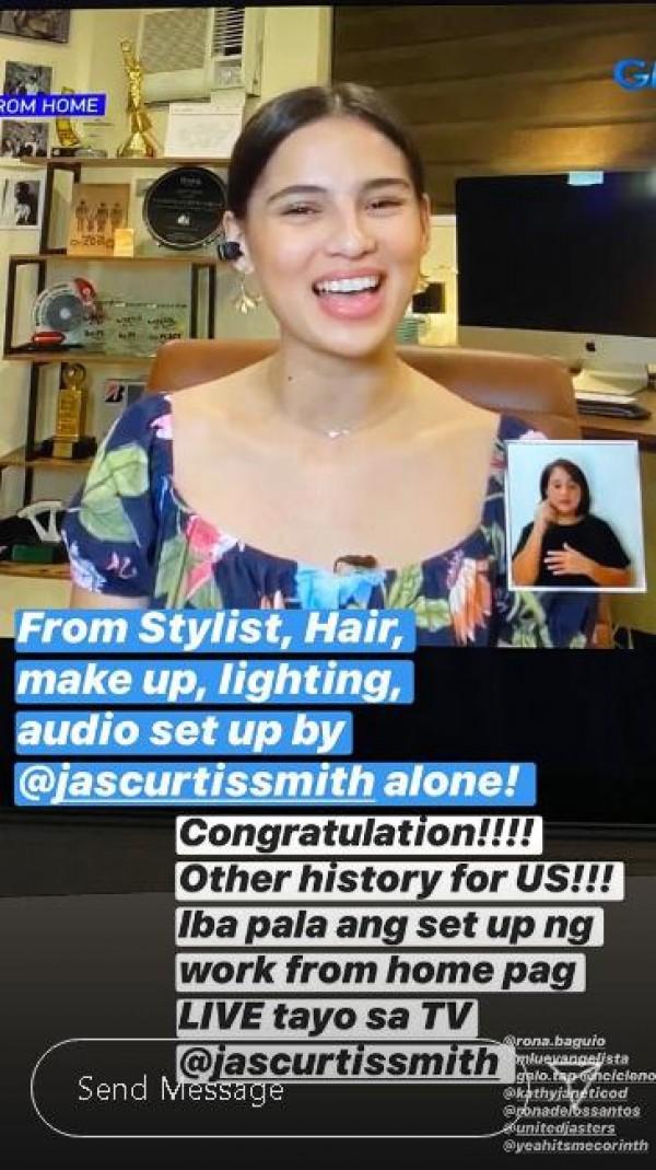 "Congratulations!!! Other history for US!!! Iba pala ang set up ng work from home pag LIVE tayo sa TV @jascurtissmith," Betchay wrote in her Instagram Story.