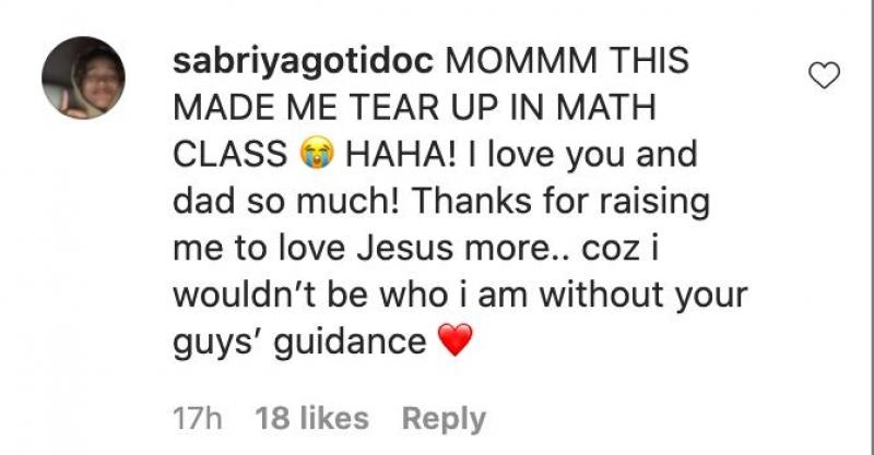 Sabiya, for her part, commented on the post, saying her mother's Instagram post made her tear up when she saw it during her math class.