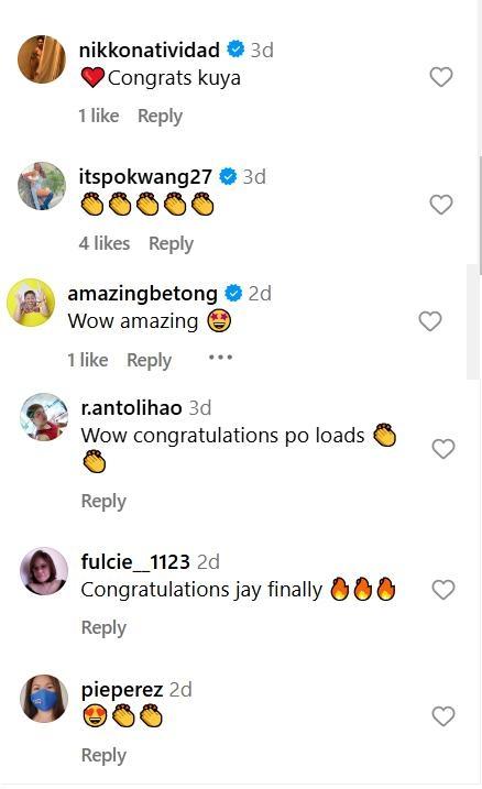 Award-winning comedienne Pokwang and Bubble Gang star Betong Sumaya left comments on Jayson's post congratulating him on this new milestone in his life.