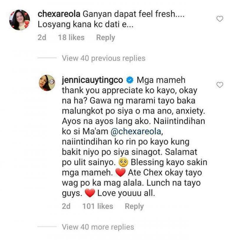 “Mga mameh thank you appreciate ko kayo, okay na ha? Gawa ng marami tayo baka malungkot po siya o ma ano, anxiety. Ayos na ayos lang ako. Naiintindihan ko si ma'am, naiintindihan ko rin po kayo kung bakit niyo po siya sinagot. Salamat po ulit sa inyo. Blessing kayo sa 'kin mga mameh. Ate Chex okay tayo 'wag ka po mag-alala. Lunch na tayo guys. Love youuu all,” reaction ng aktres.
