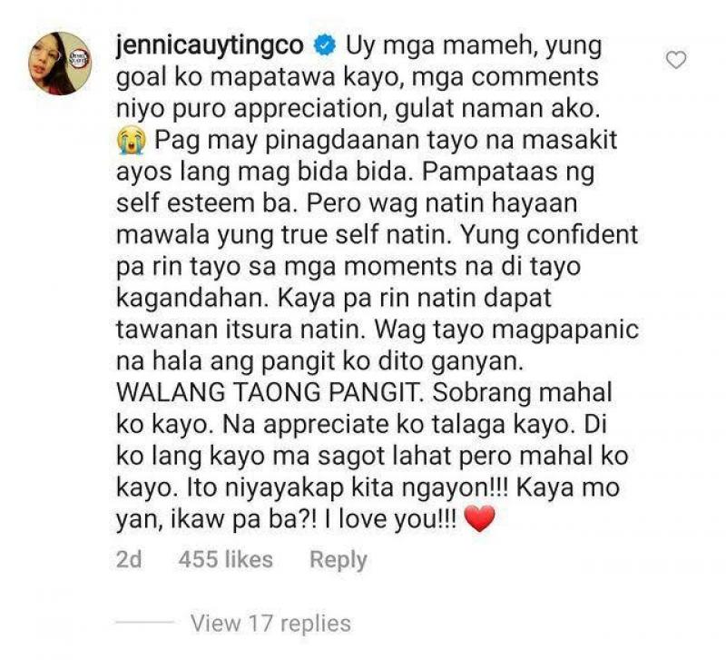 "Kaya pa rin natin dapat tawanan itsura natin. 'Wag tayo mapa-panic na hala pangit ko rito ganyan. Walang taong pangit. Sobrang mahal ko kayo. Na-appreciate ko talaga kayo. 'Di ko lang kayo masagpt lahat pero mahal ko kayo. Ito niyayakap kita ngayon!!! Kaya mo 'yan ikaw pa ba! I love you!!!” ani pa ni Jennica.