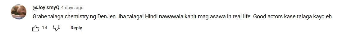 Sabi sa isang comment, "Grabe talaga chemistry ng DenJen. Iba talaga! Hindi nawawala kahit mag asawa in real life. Good actors kase talaga kayo eh."