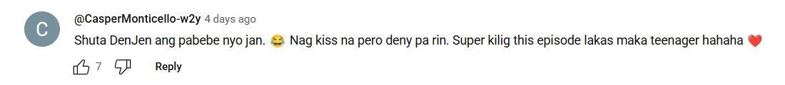 "DenJen ang pabebe nyo jan. Nag kiss na pero deny pa rin. Super kilig this episode lakas maka teenager hahaha."