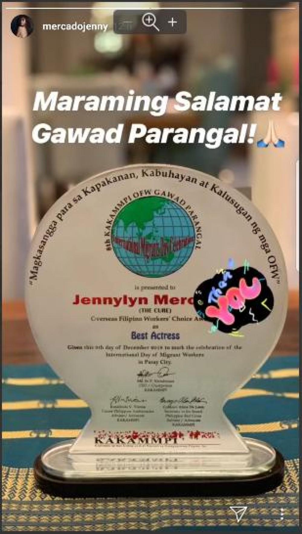 Jennylyn also bagged the Best Actress Award at the 8th KAKAMMPI OFW Gawad Parangal for her performance in the defunct GMA primetime series The Cure.