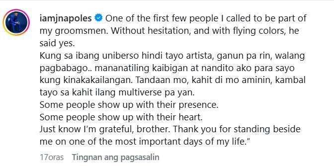 Versatile actor and theater performer Jerald Napoles penned a heartwarming thank you message to one of his closest showbiz friends, Alden Richards, who flew all the way to Bohol to be one of his groomsmen at his wedding last March 1.