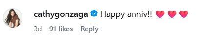 Many of the couple's friends from showbiz also commented and sent their greetings to the pair. These included Megastar Sharon Cuneta, Alex Gonzaga, Melai Cantiveros-Francisco, and Sue Ramirez.
