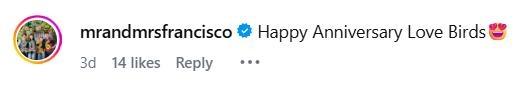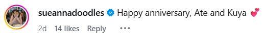 “Happy anniversary, Ate and Kuya,” Sue commented.