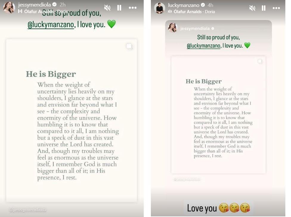 Sa Instagram story, sinabi ni Jessy, 'Still proud of you, @luckymanzano, I love you."