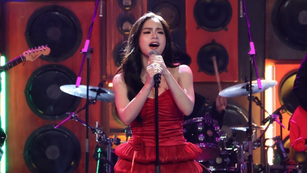 Suot ang short red dress at fiery red heels, kinanta niya nang live ang kanyang pop song na tungkol sa unang spark ng pag-ibig.