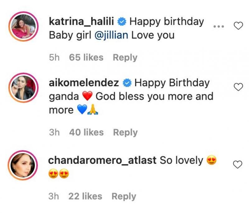 Seasoned actress Aiko Melendez wrote, "Happy Birthday ganda. God bless you more and more." while veteran actress Chanda Romero wrote, "So lovely."