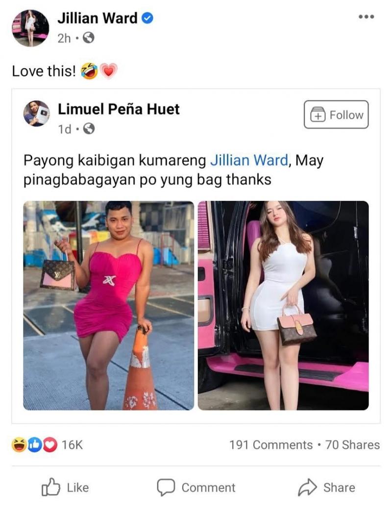 "Payong kaibigan kumareng Jillian Ward, may pinagbabagayan po 'yung bag thanks," sabi ni Limuel Pena Huet.