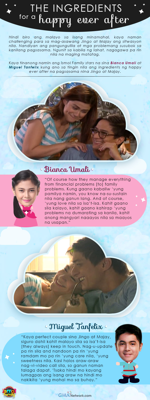 We ask Kapuso love team, Bianca Umali and Miguel Tanfelix, what's the secret ingredient to Jingo (Ryan Agoncillo) and Majay's (Carla Abellana) happy ever after? Find out their answer in this infographic.