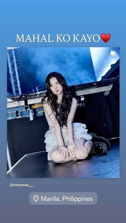 Throughout the fan meeting, Jisoo engaged in heartfelt interactions with fans, expressing her gratitude for their unwavering support. She received flower bouquets and a layered cake as tokens of appreciation from the audience. In a touching moment, she assured her Filipino fans with the promise, "See you soon." Following the event, Jisoo shared her affection on social media by posting "mahal kita" (I love you) on her Instagram Story, further endearing herself to the local fan base.
