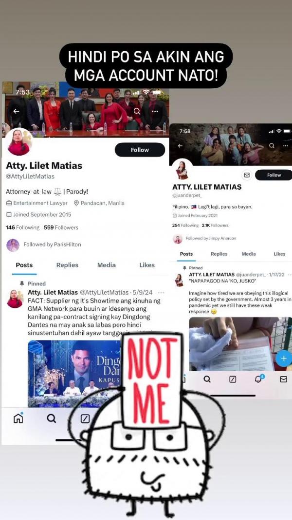 Sa Instagram stories, nilinaw ni Jo na hindi siya ang humahawak sa accounts na may username na @AttyLiletMatias at @juanderpet_. Ang dalawang account ay may pangalang 'Atty. Lilet Matias.'