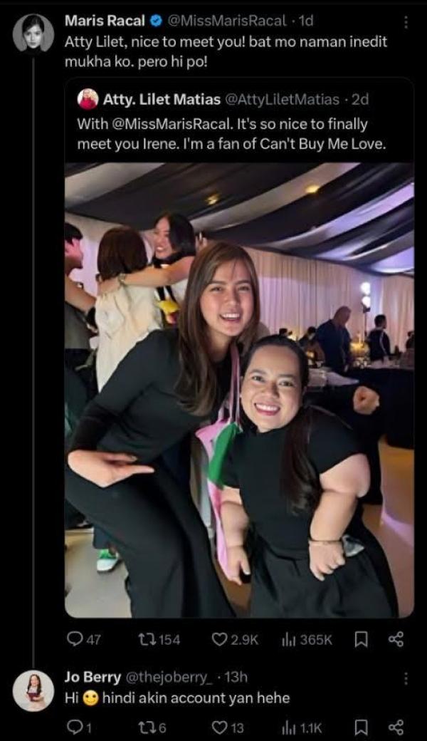 May post kasi ang @AttyLiletMatias kung saan makikita ang litrato nina Jo at Maris at may katagang, "With @MissMarisRacal. It's so nice to finally meet you, Irene. I'm a fan of Can't Buy Me Love."