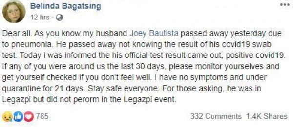 Belinda announced the result of Joey's test through Facebook, saying her husband passed away suffering from what they thought was severe pneumonia, without knowing he was COVID-19 positive since his test results arrived after his death.