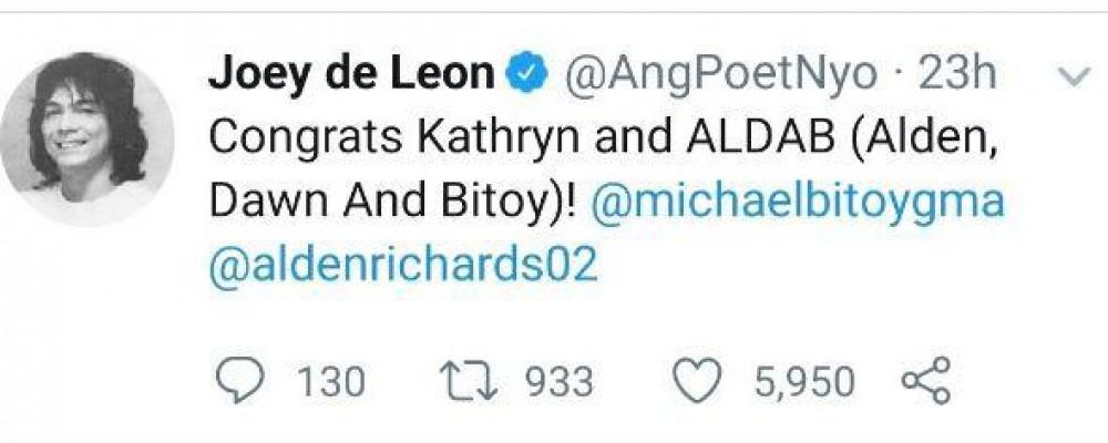 On Twitter, Eat Bulaga pioneer and Henyo Master Joey de Leon posted his congratulatory message for Michael V., Dawn Zulueta, and Alden Richards.