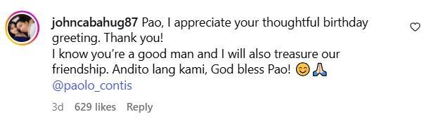 Nagpasalamat din si John kay Paolo. Sa post ng huli, nag-comment ang una, “Pao, I appreciate your thoughtful birthday greeting. Thank you!”