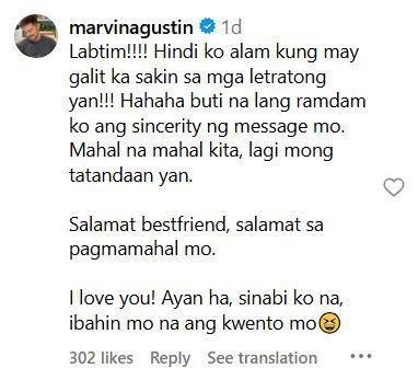 In the comments section, Marvin responded, "Labtim!!!! Hindi ko alam kung may galit ka sakin sa mga litratong yan!!!"