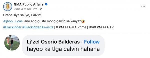 "Natutuwa din po ako sa mga komento ng mga Kapuso po natin na nanonood ng Black Rider kasi lagi ko pong sinasabi, masakit man 'yung sinasabi nila, 'yun po talaga 'yung nagbibigay po sa atin ng kumpiyansa. 'Yun po 'yung nagpapatotoo na effective po 'yung ginagampanan natin," paliwanag ng aktor.