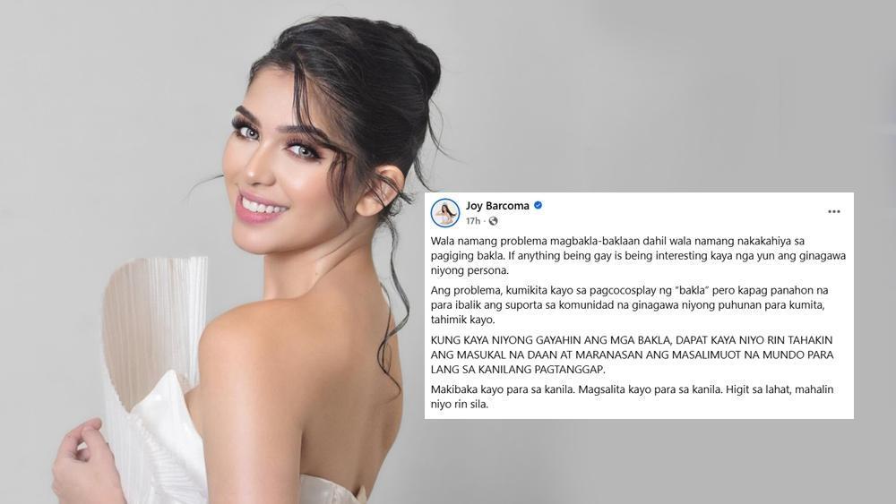 Miss Earth Philippines and digital content creator Joy Barcoma is among those taking a stand and joining the ongoing discussion about individuals involved in “bakla-baklaan” or straight men portraying gay people.