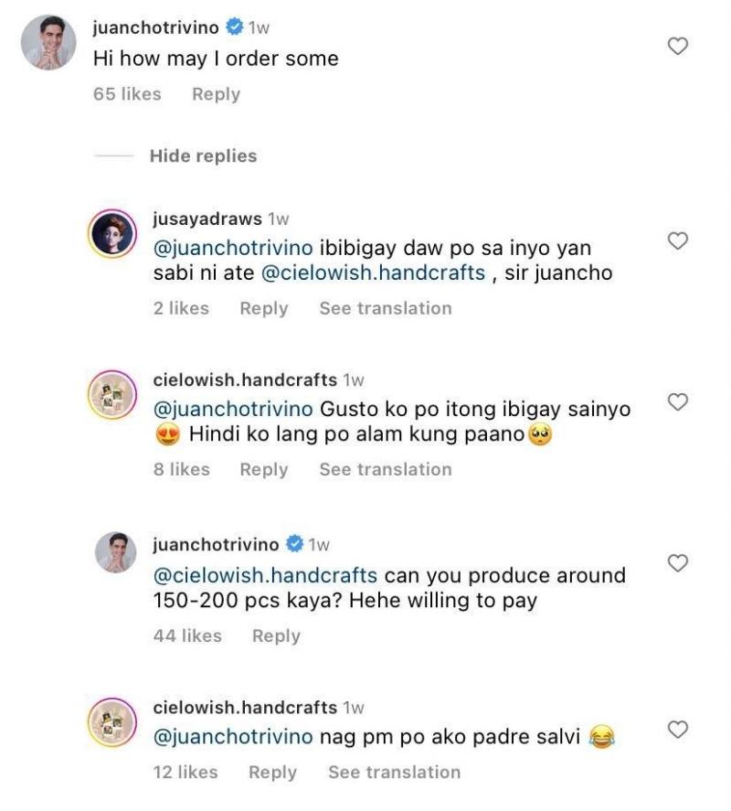 And Juancho showed appreciation for the cute crocheted piece as he not only liked the post but also asked how he can order the doll.