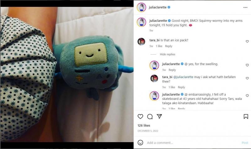 Sa Instagram post ni Dabarkads Julia noon December 5, 2022, sinabi niyang nahulog siya sa isang skateboard matapos tanungin ng isang follower kung bakit niya kailangan gumamit ng ice pack.