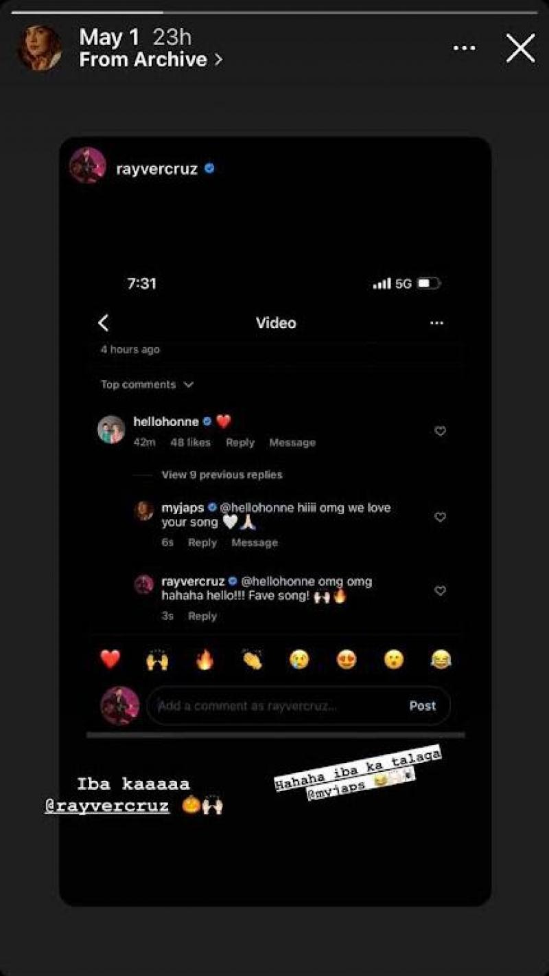 In the latest post on Rayver's Instagram account of the two singing the Honne song “Location Unknown,” they were noticed by the English band, who left a heart emoticon on the post. Naturally, Julie and Rayver were overwhelmed with the comment, both replying that they love the song and that it is their “fave.” They also posted about the interaction on their Instagram Story.