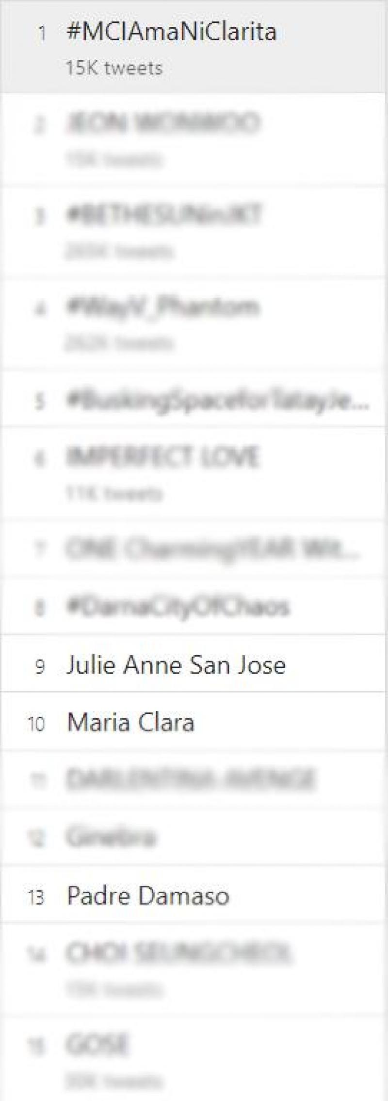 Sa katunayan, nanguna ang official hashtag ng episode ng #MCIAmaNiClarita sa top ten trending topics ng Twitter Philippines.