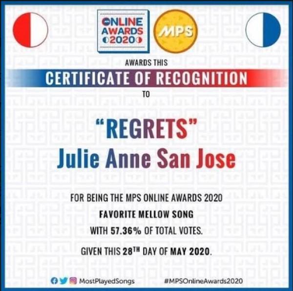 The Asia's Pop Diva bagged Favorite Mellow Song for her single "Regrets" after getting more than 57% of the votes. She was also hailed as Favorite Female OPM Artist after getting 48% of the total votes.