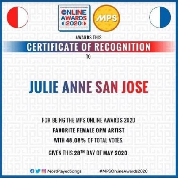 Multi-awarded Kapuso singer Julie Anne San Jose nailed another big win at the MPS Online Awards 2020.