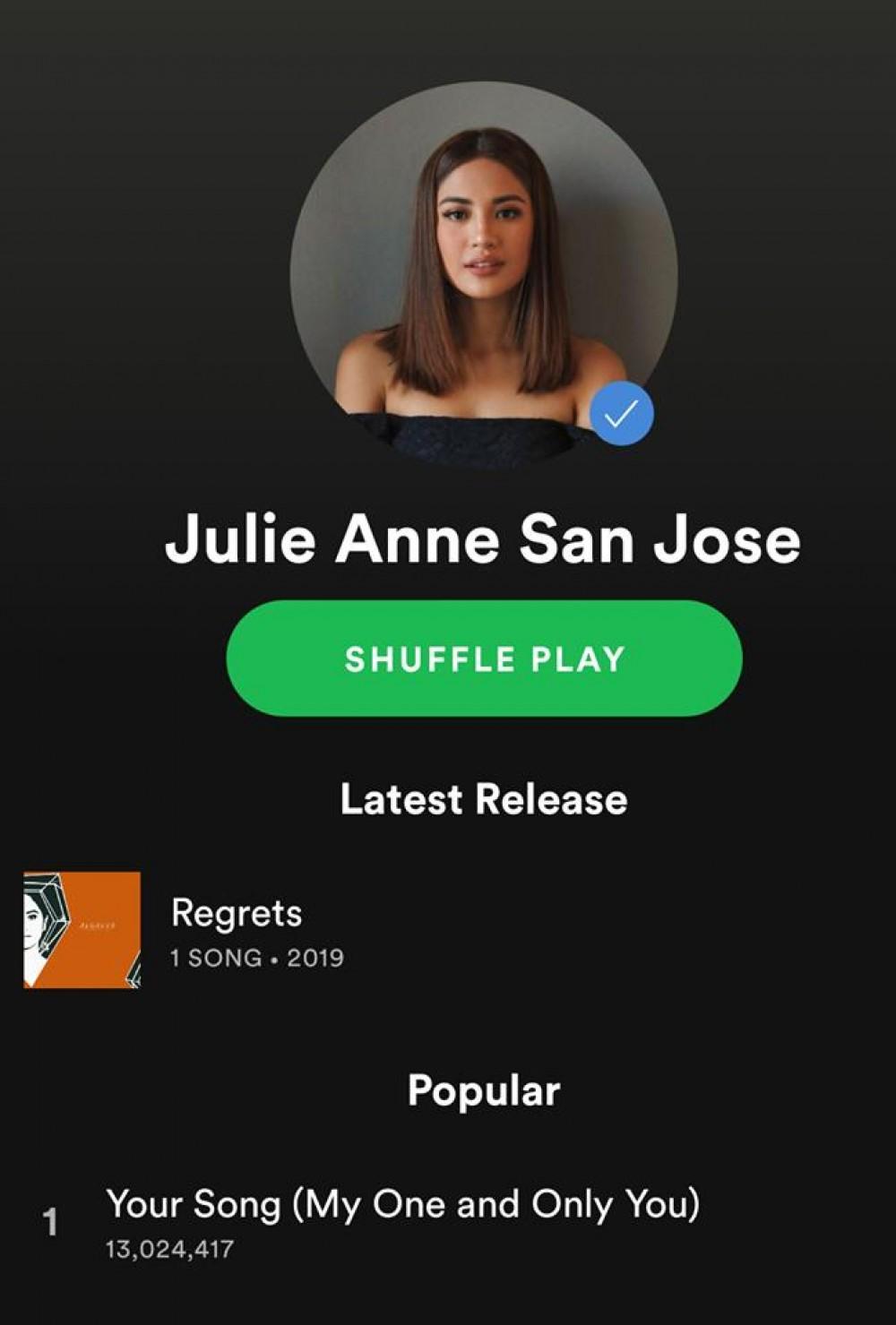 Asia's Pop Sweetheart Julie Anne San Jose's hit rendition of Parokya ni Edgar original “Your Song” has reached over 13 million streams on the online music platform Spotify.