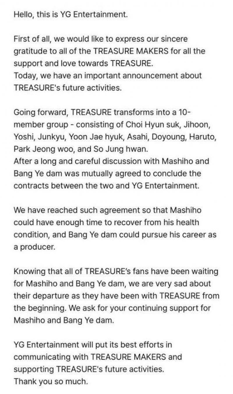 “Knowing that all of TREASURE's fans have been waiting for Mashiho and Bang Ye dam, we are very sad about their departure as they have been with TREASURE from the beginning. We ask for your continuing support for Mashiho and Bang Ye dam.
