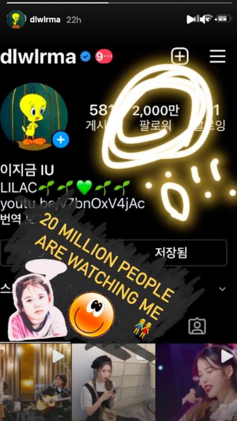 IU, whose real name is Lee Ji-eun, celebrated the occasion with a screenshot of her recent number of followers captioned, “20 million people are watching me.” She is currently the 12th most followed Korean personality on the said platform.