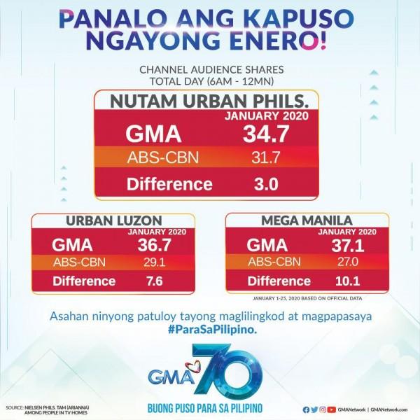 According to the latest data provided by Nielsen TV Audience Measurement for January, GMA registered an average total day people audience share of 34.7% in the National Urban Television Audience Measurement (NUTAM), beating ABS-CBN's 31.7%.