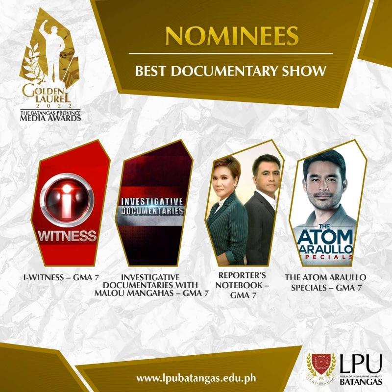 Pagpipilian naman para sa Best Documentary Show ang I-Witness, Investigative Documentaries with Malou Mangahas, Reporter's Notebook, at The Atom Araullo Specials. Kapansinpansin na tanging GMA Network lang ang mga may nominees para sa kategorya ng documentary.