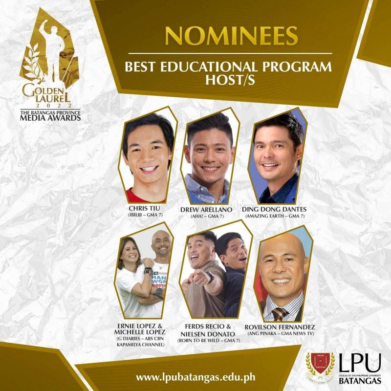Nakatanggap naman ng nominasyon para sa Best Eduicational Program Host/s sina Chris Tiu para sa IBilib, Drew Arellano para sa AHA!, Dingdong Dantes para sa Amazing Earth, Ferds Recio at Nielsen Donato para sa Born to be Wild, at Rovilson Fernandez para sa Ang Pinaka.