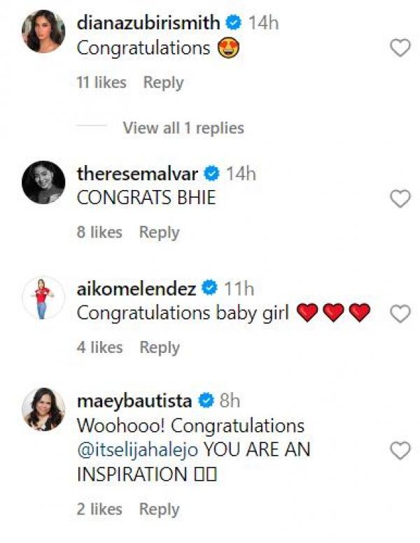 Showbiz personalities such as Diana Zubiri-Smith, Therese Malvar, Maey Bautista, and Aiko Melendez sent their congratulatory messages for Elijah in the comments section.