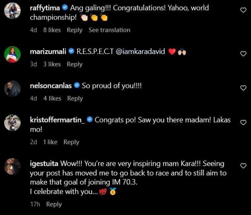Several friends offered their congratulations for winning the race and getting into the world championships, including fellow reporters like Raffy, Nelson, Mariz Umali, and fellow triathlete and Kapuso actor and singer Kristoffer Martin, who finished fifth in the same race.