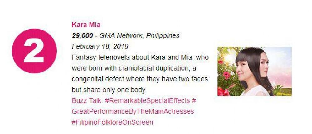 Kara Mia ranked second with at least 29,000 tweets. It was mostly talked about due to its #RemarkableSpecialEffects #GreatPerformanceByTheMainActresses and for having a #FilipinoFolkloreOnScreen.