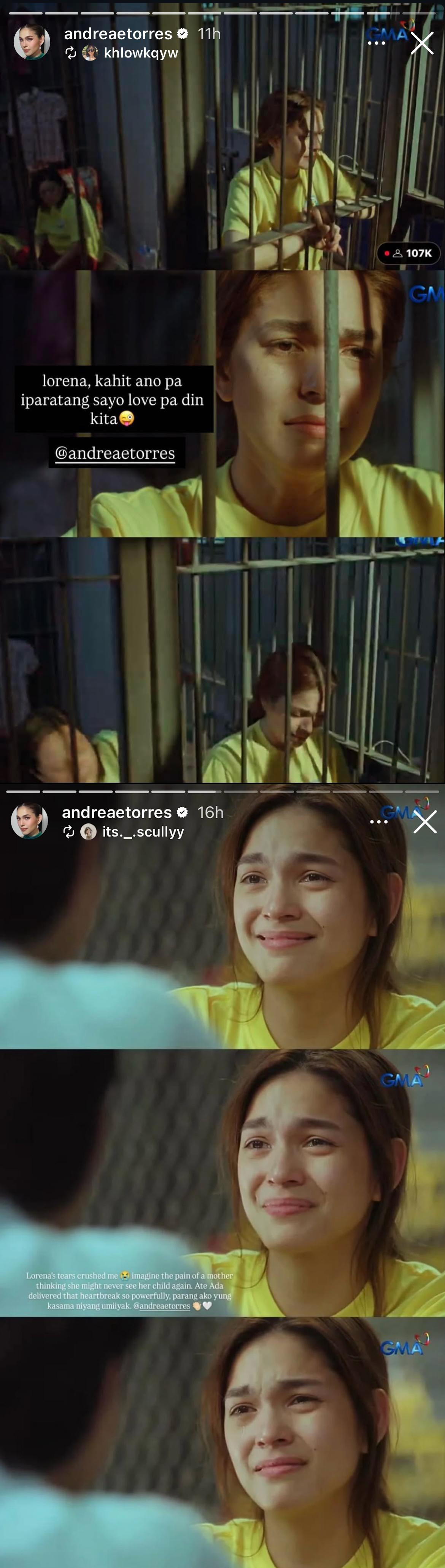 Sa Instagram, ni-repost ni Andrea Torres ang ilang post ng netizens tungkol sa kanyang karakter sa serye.