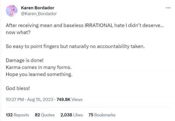 Ayon sa tweet ni Karen, “After receiving mean and baseless IRRATIONAL hate I didn't deserve…now what? So easy to point fingers but naturally no accountability taken. Damage is done! Karma comes in many forms. Hope you learned something. Godbless.”