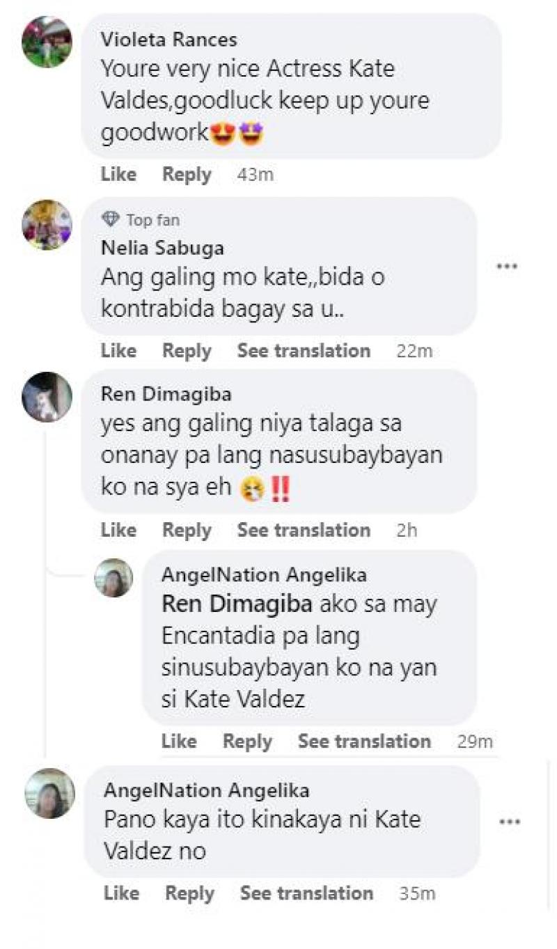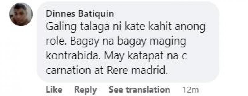 "Galing talaga ni Kate kahit anong role. Bagay na bagay maging kontrabida. May katapat na si Carnation at [Aica]," a certain Dinnes Batiquin said, mentioning Kate's other villains in the series played by Faith Da Silva and Rere Madrid.
